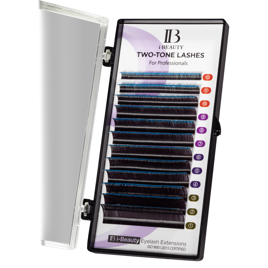 Вії I-BEAUTY Два тони – вії чорні біля основи і сині на кінчиках. З їхньою допомогою можна створити надзвичайно виразний ефект при нарощуванні вій. Виглядають креативно і вишукано, при світлі додають погляду мерехтіння. Насичені кольори, якісний матеріал та близька до натуральної текстура.